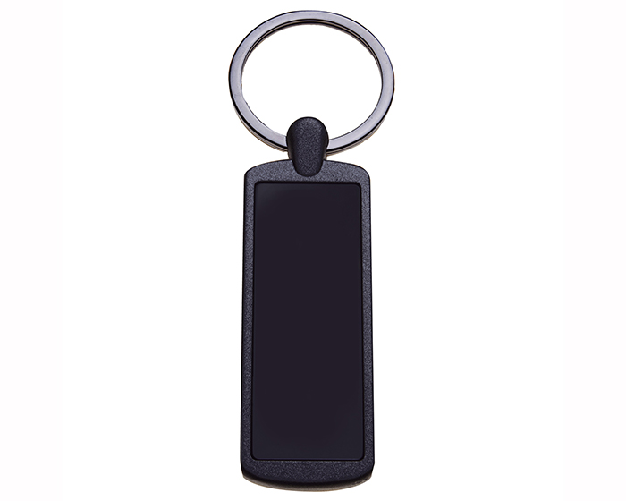 Llavero metálico con arillo reforzado y placa de metal negra para grabado en láser. Incluye caja.