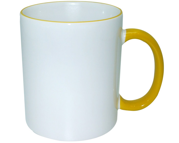 Tarro blanco para sublimación con filo y asa de color. CAP: 11 OZ.